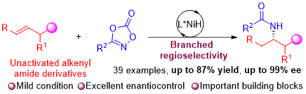 Enantioenriched diamines and β-amino amides are privileged scaffolds in organic and medicinal chemistry, which exhibit many applications in natural products and pharmaceutical molecules, as well as asymmetric catalysis. Catalytic asymmetric hydroamidation is considered one of the easiest ways to obtainsuch compounds in the enantioenriched form. Here, we report a NiH/BOX-catalyzed enantioselective hydroamidation of alkenyl amides with dioxazolones. The described transformation provides a series of enantioenriched vicinal diamines and β-amino amides, including structural modification of natural products and bioactive molecules and the preparation of the chiral radical scavenger nicaraven. A broad range of functional groups are well tolerated under room temperature with high enantioselectivities (up to 99%) and good yields (up to 87%). Mechanistic studies including the capture of a metal-nitrenoid intermediate and a competitive experiment provide significant evidence for this hydroamidation process.