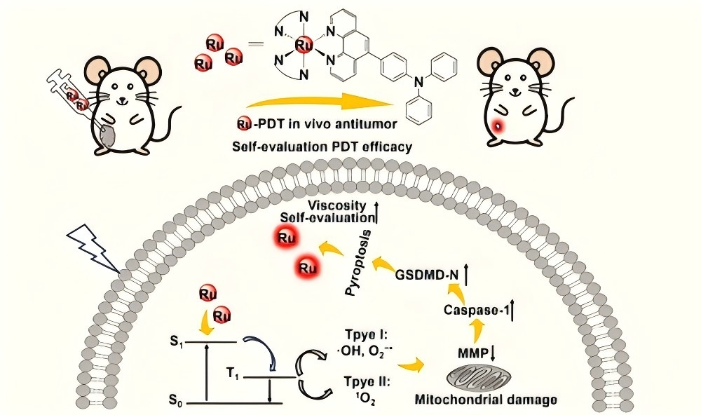 The development of a photosensitizer (PS) integrating real-time therapeutic monitoring capability represents a critical advancement in precision photodynamic therapy (PDT). Herein, three ruthenium(II)-triphenylamine photosensitizers (Ru1-3) were designed and synthesized. Detailed antitumor mechanism investigations revealed that Ru1 and Ru3 activated caspase-1, induced gasdermin D (GSDMD) cleavage and mitochondrial membrane potential (MMP) depolarization, and triggered cell pyroptosis. An increase in the luminescence intensity of Ru1 and Ru3 was observed during cell pyroptosis, indicating a significant augmentation of cytoplasmic viscosity during pyroptosis. Moreover, two-photon excitation experiments verified that they possessed photocytotoxicity in 3D multicellular tumor spheroids (MCTSs), and a similar luminescence amplification correlated with pyroptosis progression was observed. In vivo studies confirmed that Ru3 exhibits superior PDT efficacy and provides real-time feedback on treatment response via its self-reporting luminescence characteristics. This work provides new insights into the design and implementation of multifunctional photosensitizers for tumor cell pyroptosis with real-time therapeutic monitoring and two-photon imaging.